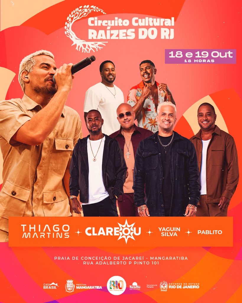 Dias 18 e 19 de outubro, a partir das 18h, a Praia de Conceição de Jacareí vai ser palco de muita música e alegria com o Circuito Cultural Raízes do RJ. O evento vai contar com shows de Thiago Martins, Clareou, Yaguin Silva e Pablito!