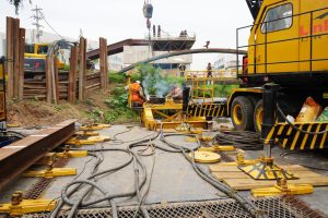 Uma das fases mais críticas da obra de construção da ponte que vai ligar os bairros Aterrado e Aero Clube, que integra o Plano de Mobilidade Urbana de Volta Redonda, a preparação das fundações da estrutura teve início no final de outubro, com a cravação das primeiras estacas – de um total de 16 – do pilar P-3 no Rio Paraíba do Sul, na margem do lado da Rua Desembargador Ellis Hermydio Figueira, no Aterrado. Essa é a primeira fase do serviço após a montagem, em setembro, da balsa que serve de base para os equipamentos necessários à execução das fundações no meio do rio.