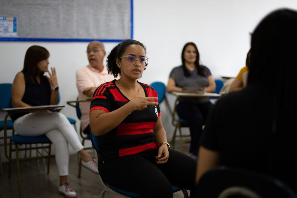 “Normalmente, a educação de surdos em faculdades é feita com um intérprete, e só com ele não é o suficiente, porque os alunos acabam perdendo as informações e o intérprete não consegue passar tudo. No nosso projeto, além de termos dois intérpretes acompanhando as aulas à noite, temos reforço à tarde, 100% em Libras. Os professores de Administração são fluentes em língua de sinais, temos uma professora